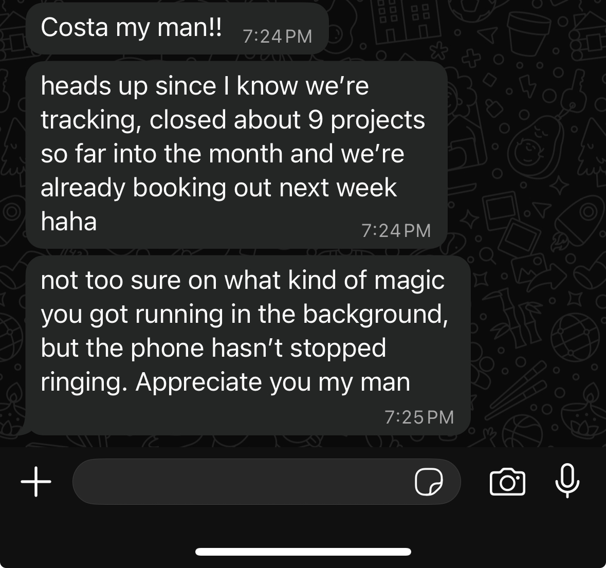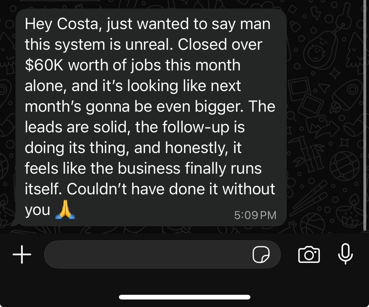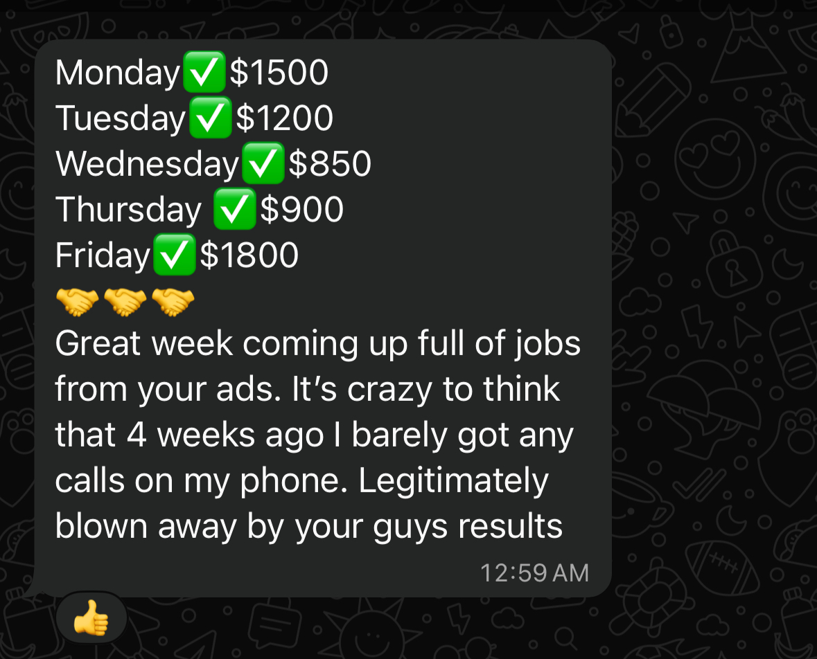 I honestly didn’t expect results this fast. Within the first week we were already getting solid appointments, and by the end of the month we closed around $60K in job, with about $30–38K in take-home profit. My entire crew of eight guys has been booked solid ever since. Between buying materials and checking on job sites, it’s been nonstop work, and that’s a great problem to have. Really appreciate what these guys did for us!